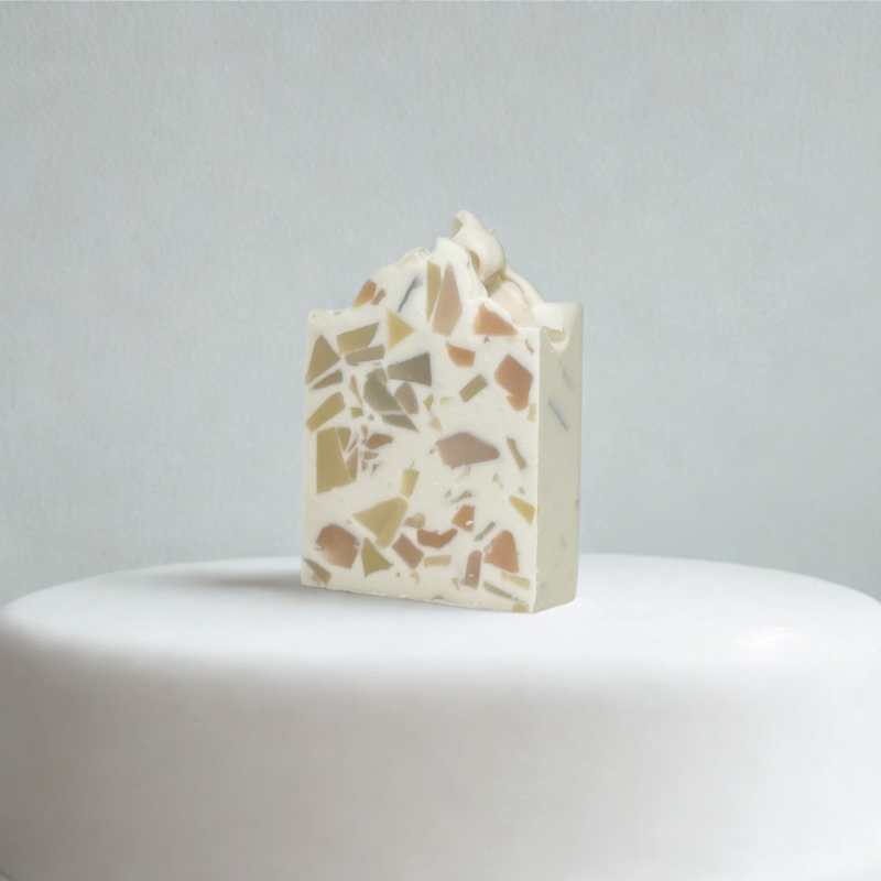Treat yourself to the luxury of our delicately cleansing soap, leaving your skin feeling soft and nourished. Our terrazzo soap is unique, we chop up our premium soap scraps by hand and mix it into our soaps to give a beautiful terrazzo effect. The base for this soap is fragranced with lemongrass and sage. Our Lavender, Cucumber, and Sage fragrance is like a refreshing gin and tonic. It’s a delightful mix of floral and fresh scents, offering a bright, invigorating, yet soothing experience. The beautiful colours of our soaps are from natural pigments. Enjoy the goodness of cold-processed soap daily!